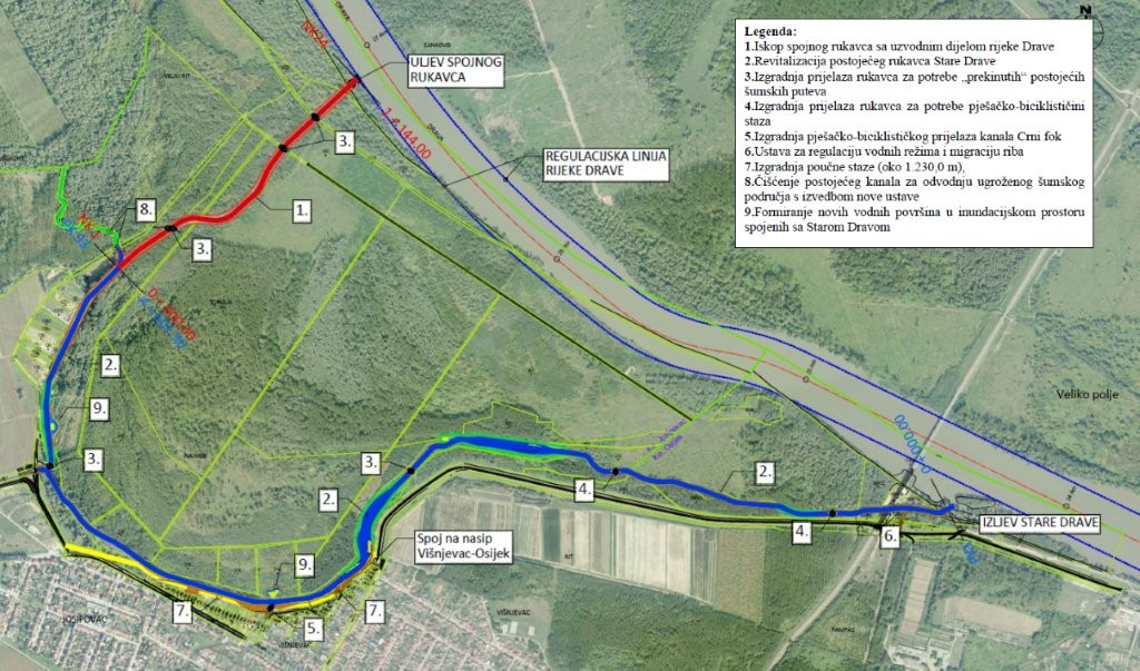 Na lijevoj obali rijeke Drave od rkm 24 do rkm 27, nizvodno od grada Osijeka pored naselja Višnjevac i Josipovac, nalazi se stari tok rijeke Drave duljine oko 5.744 m koji je s vremeno postao rukavac sa stajaćom vodom. S rijekom Dravom je spojen samo na nizvodnom dijelu, a uslijed taloženja nanosa, nakupljenih grana i lišća je značajno zamuljen, obrasao gustom vegetacijom i većim dijelom potpuno nepristupačan. Cilj projekta je osigurati stabilnu protočnost velikih vodnih valova rijeke Drave i zaobalnih voda iz Poganovačkog-Kravičkog kanala i kanala Crni Fok, te zaštite važnih staništa i vrsta.